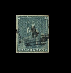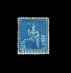 #21c, 1863 1/- Blue error of color, mint example of this very rare stamp that was printed in error but never placed into use, the few copies that exist were marked with a pen and circulated by the Barbados Colonial Secretary, this mark was removed on most as is the case with this stamp which
