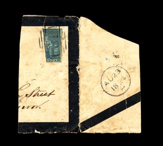 #3b, 1854 (2p) Grayish slate on blued paper, vertical bisect used as 1p, on large piece of mourning cover including portion of backflap, neatly tied by numeral "10" of St. Peter parish post office, this bisect was only authorized between August 4th and September 21st, 1854, "AU 23/1854" c.d.s