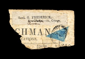 #14b, 1861 (1p) Pale blue, clean-cut perf. 14 to 16, diagonal bisect used as 1/2p, clearly tied by numeral "1" cancel in bars to piece of newspaper with address label of Rev. Frederick at St. George, the 1/2p newspaper rate was the typical use of these bisects and are usually collected on pie