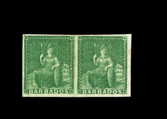 S.G. #22a, 1861 (1/2p) Grass green, imperforate horizontal pair, bright fresh color of the scarcer shade of the imperforates that apparently came from a sheet out of the Perkins, Bacon & Co. archives, clear to large margins all around, o.g., h.r., very fine; 1959 RPS certificate (Scott #15b v