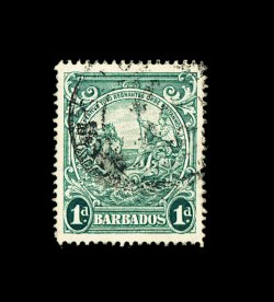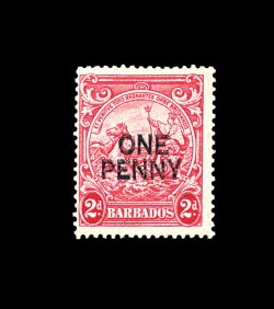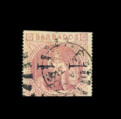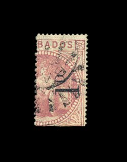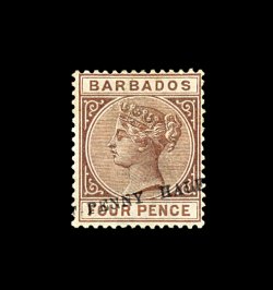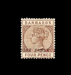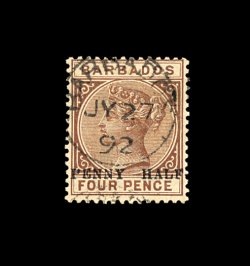 S.G. #104d, 1892 "Penny Half" surcharge error on 4p Brown, used single with central "Barbados/JY 27 92" c.d.s., centered to the top as all are from the single sheet with this with misaligned surcharge, most known copies bear this cancel, very fine; it is believed that less than 20 examples ar