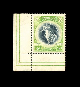 S.G. #202c, 1920 1/2p Victory, substitute crown in the watermark, a lovely bottom left corner sheet-margin single, the variety clearly showing in the bottom left corner of the stamp, because it has the selvage the slightly different "CA", which was replaced at the same time, shows as well, o.