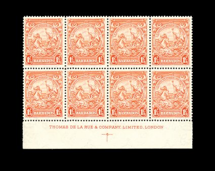 #195 var., 1938 1 1/2p Red Orange, wmk. multiple Crown and script "CA", "A" of "CA" missing, Thomas De La Rue bottom sheet-margin imprint block of eight, well centered and fresh, the watermark error is found in the bottom selvage below the second stamp from the right, light natural gum wrink