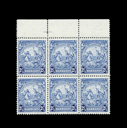#196 var., 1938 2 1/2p Ultramarine, wmk. multiple Crown and script "CA", "A" in "CA" missing, mint top sheet-margin block of six, watermark error is found in the selvage above the center stamp, particularly dark shade of Ultramarine (called blue by Stanley Gibbons), possesses pristine freshne