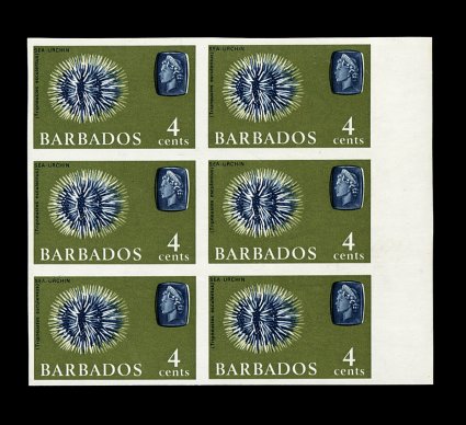 #270a, 1965 4c Olive green and dark blue, imperforate, mint right sheet-margin block of six (2x3), o.g., n.h., very fine and scarce (S.G. #325a; £675+).