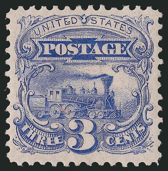 Original sales figures show that among the 1869 Pictorial Re-Issues, the 3c and 90c stamps accounted for the smallest number of units sold (1,406 and 1,356, respectively). Overall, the 1869's were popular with stamp collectors, far outselling the 1851-60 and 1861-66 Re-Issue sets. However, the 90c stamp's high denomination and the availability of ordinary 3c stamps limited demand. Today, both are rare, and handling over the years has not been kind to most of the surviving examples. This 3c is remarkable not only for its centering, but also its overall freshness and lightly-hinged gum.