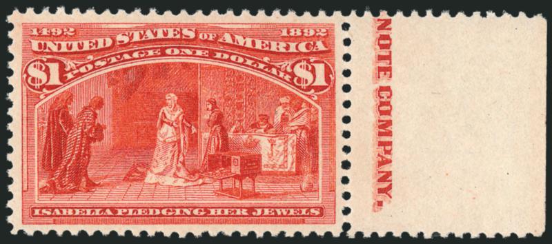 We could not begin to count the number of $5.00 Columbian stamps sold by the Siegel firm over 80 years. However, the number of Extremely Fine, Mint Never Hinged, examples is very limited. Due to the high face value multiples are very rare. For much of philatelic history stamps were hinged into albums. This fact, plus the lack of multiples, explains the scarcity of Mint N.H. copies. The stamp offered here is certainly a contender for the top position of any we have ever encountered.