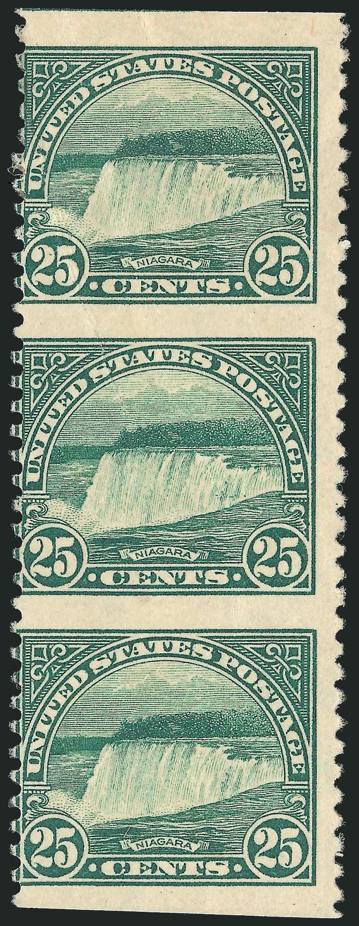 FINE APPEARING STRIP OF THREE OF THE 25-CENT 1922 ISSUE IMPERFORATE HORIZONTALLY. ONE OF THE RAREST OF ALL 1922 ISSUE PERFORATION VARIETIES.