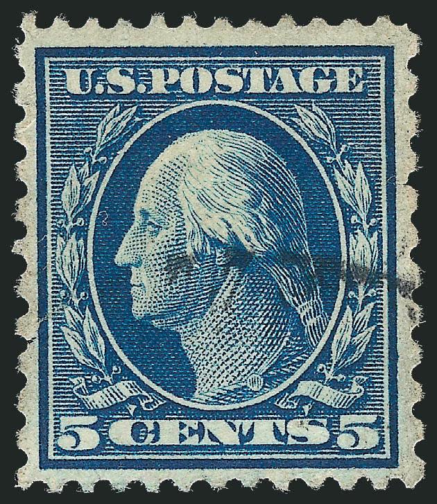 VERY FINE AND CHOICE EXAMPLE OF THE 1914 5-CENT PERF 12 x 10 ISSUE. ONLY SEVEN SOUND WELL-CENTERED EXAMPLES ARE RECORDED.