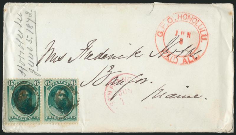1872 legal-size cover to Master Frederic1864, 2c Rose Vermilion (31). Horizontal strip of six, used with 6c Yellow Green (33) and cancelled by seven strikes of negative "HI" oval, red "G.P.O. Honolulu, Paid All, Jun. 5" double-circle datestamp on 1872 legal-size cover to Master Frederick H. Allen in Bangor Me., magenta "San Francisco Paid All Jun. 17" circular datestamp, cover and some stamps with faults, still an impressive multiple franking paying the three-times rate (Image)