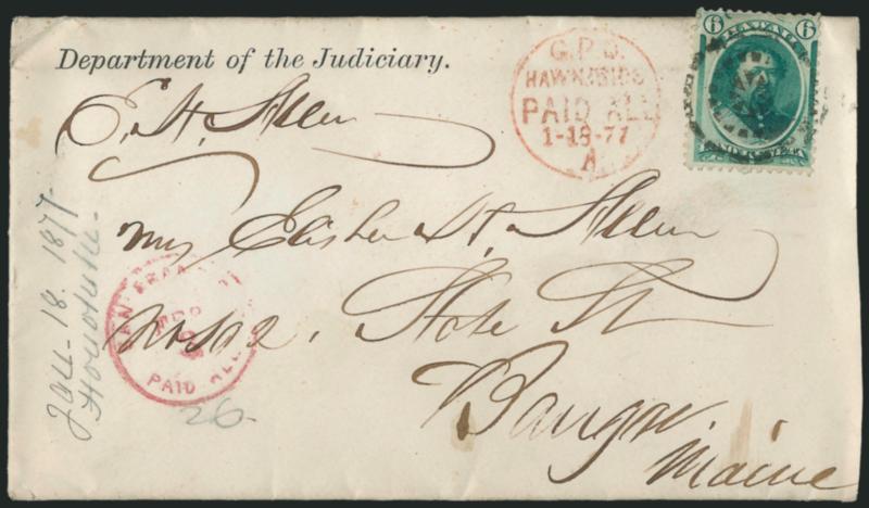 Bangor Me., magenta San Francisco P1871, 6c Yellow Green (33). Tied by 3-ring segmented target cancel, red "G.P.O. Haw'n.Islds Paid All 1-18-77 A" circular datestamp on "Department of the Judiciary" corner card cover to Mrs. Elisha H. Allen in Bangor Me., magenta "San Francisco Paid All Feb. 3" transit datestamp, stamp with faults at top from placement over edge, otherwise Very Fine (Image)