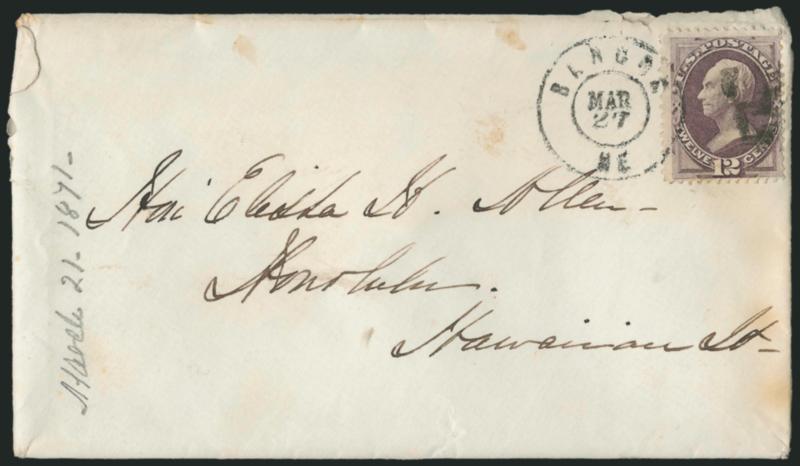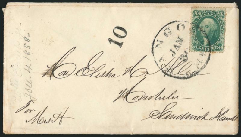 Several covers from the Allen correspondence from the East Coast to Hawaii were overweight and are franked with two 10c stamps. Others are known with one 10c stamp and a "10" due marking, such as the example offered here. This is the only example of the 1857 10c Ty. IV to Hawaii we have encountered.