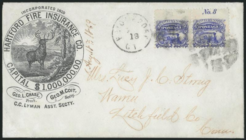 card cover to local addressee, slightly reduced at right and some slight soiling, otherwise Very Fine, colorful combination of 1c 1869, fancy cancel and illustrated corner card (Image)Search for comparables at SiegelAuctions.com |