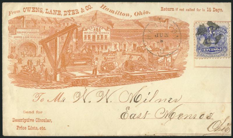 3c Ultramarine (114). Tied by cork cancel, matching "Hamilton O. Jun. 8" circular datestamp on beautiful all-over Eclipse Machine Works illustrated advertising cover depicting flatbed