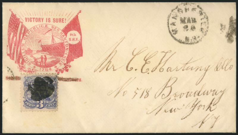 3c Ultramarine (114). Indistinct cork cancel, affixed to 1870 slogan patriotic cover of the 9th New Hampshire Volunteers with red "Victory is Sure!" between flags, "Manchester N.H. Mar. 26"