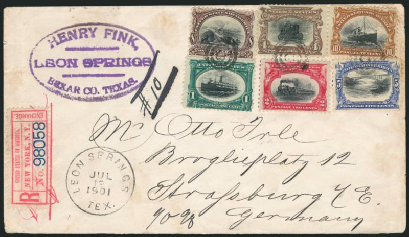 appropriately backstamped, 10c small corne1c-10c Pan-American (294-299). Complete set tied by tiny targets on registered cover to Germany, "Leon Tex. Jul. 13, 1901" circular datestamp, registry label and large purple oval handstamp return cachet, appropriately backstamped, 10c small corner crease and 5c trivial edge toning, slight cover wear, otherwise Fine, still rather attractive in the overall and certainly very scarce (Image)
