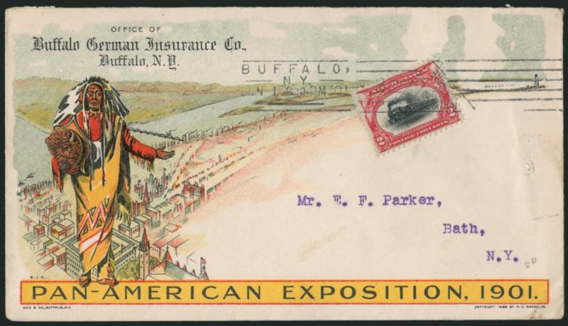 Company to Bath N.Y., receiving bac2c Pan-American (295). Tied by "Buffalo N.Y. Jun. 1 2:30 PM '01" exposition machine cancel on illustrated "Pan-American Exposition, 1901" design depicting an Indian and the city from the Buffalo German Insurance Company to Bath N.Y., receiving backstamps, Very Fine and choice (Image)