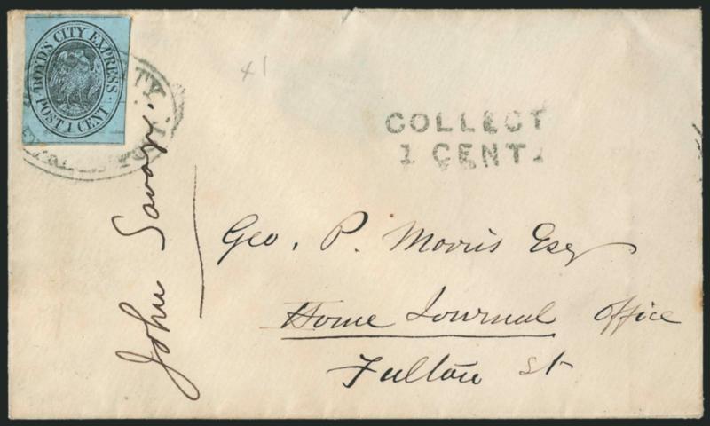 4064 c Boyds City Express, New York N.Y., 1c Black on Blue Gray (20L18).> Large margins, tied by neat strike of oval Boyds City Express Post handstamp on cover to local address, neat Collect1 Cent handstamp, Very