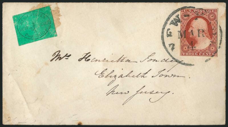 Elizabethtown N.J., FineMessenkope's Union Square Post Office, New York N.Y., (1c) Black on Green Glazed (106L1). Large margins, light creases, used with 3c Dull Red, Ty. II (11A) tied by "New-York Mar. 4" circular datestamp to Elizabethtown N.J., Fine (Image)