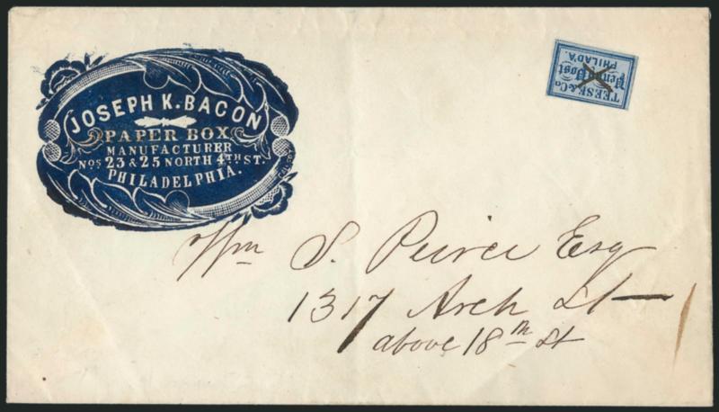 trivial wear, Very Fine, rare use of the TeTeese & Co. Penny Post, Philadelphia Pa., (1c) Blue on Bluish (137L1). Large margins to just in, cancelled by ms. "X" (not tied) on paper box manufacturer's blue cameo corner card cover to local address, trivial wear, Very Fine, rare use of the Teese & Co. stamp on a cameo corner card cover, about a dozen covers known with this rare local (Image)