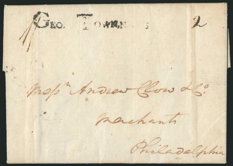 GEO. TOWN, Nov. 5. Neat straightline datestamp with ms. "2" dwt rate and "1/" due in local currency on 1790 folded letter to Philadelphia, light vertical file folds and minor soiling, Very Fine usage