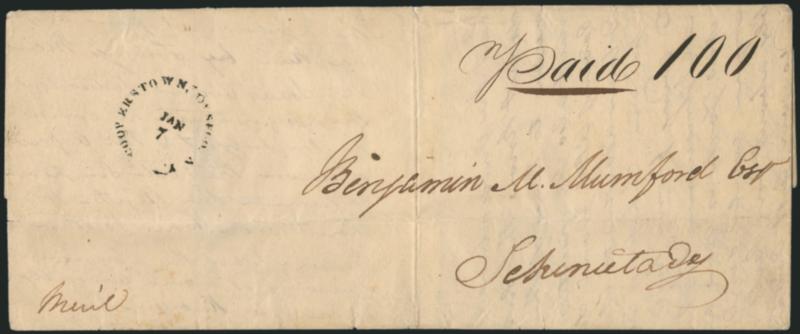 Cooperstown, Otsego, N.Y. Jan. 7. Clear strike of rimless circular datestamp with ms. "Paid 1.00" on 1817 oversize folded letter to Schenectady N.Y., vertical file fold well away from markings, Very Fine strike