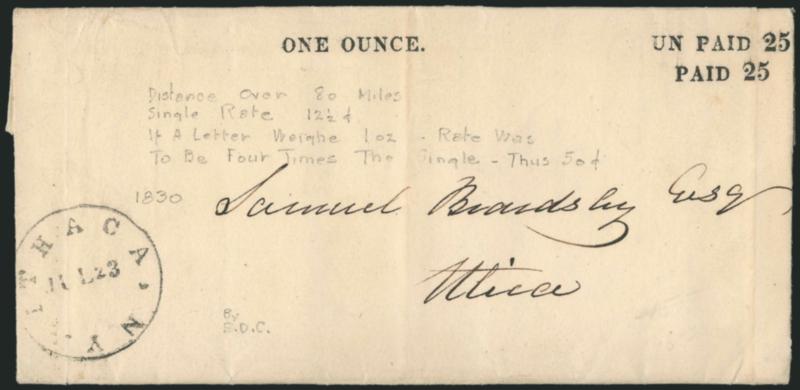 Ithaca N.Y. Jul. 23. Clear strike of circular datestamp with bold "ONE OUNCE." with "UN PAID 25" and "PAID 25" straightline handstamps at top of 1830 folded letter which contained a legal notice to