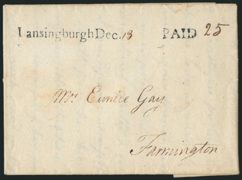Lansingburgh. Two, one from 1802 paying 25c rate to Farmington, second from 1823 and paying 10c rate to Pittsfield Mass., distinctly different markings, both are Very Fine strikes, the first ex Jarrett