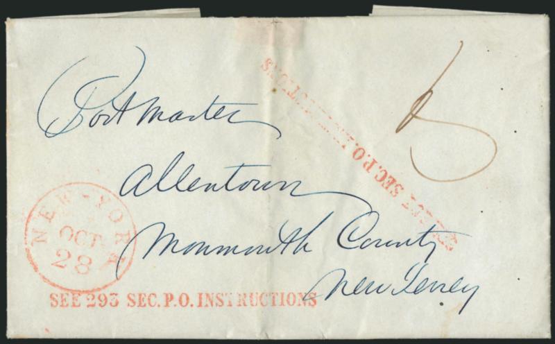 (New York N.Y.) "See 293 Sec. P.O. Instructions". Five folded letters or covers, each with this red straightline handstamp, three with two-line version, two with single-line version, "New-York" circular