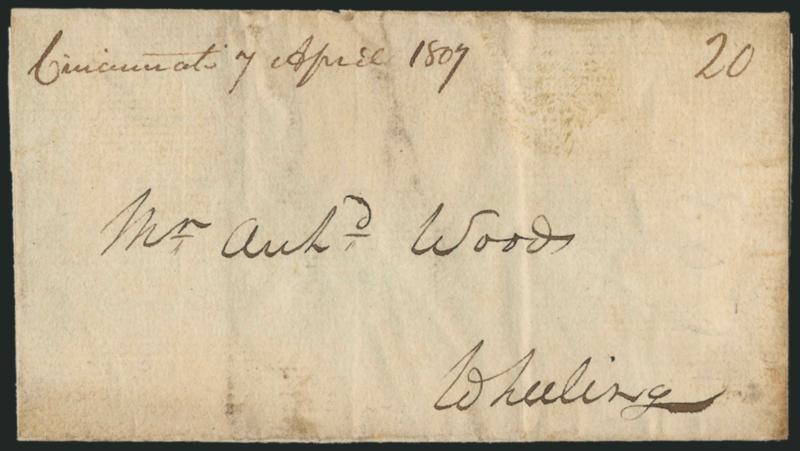 "Cincinnati 7 April 1807". Manuscript postmark with "20" rate on folded cover to Wheeling, some slight wear, Very Fine, the post office at Cincinnati used a manuscript postmark during the Northwest