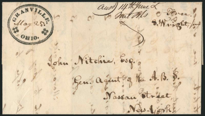 strike of fancy oval datestamp with date in ms., "Free" and postmaster's frank on 1833 folded letter to New York, Extremely Fine strike (Image)Search for comparables at SiegelAuctions.com |
