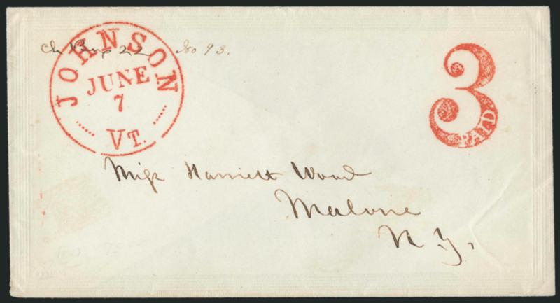 Vt. Two lady's covers each with perfect strike of red circular datestamp, one with additional "5" and "Paid" handstamps, other with "3 Paid" handstamp, Extremely Fine, a beautiful pair of covers (Image)Search for comparables at SiegelAuctions.com |