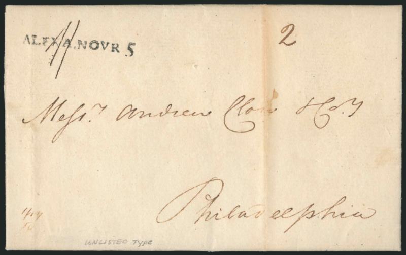 ALEXA, NOVR 5. Bold strike of straightline datestamp with ms. "2" dwt rate and "1/" due in local currency on 1790 folded letter to Philadelphia, light vertical file folds, Extremely Fine strike, illustrated in ASCC