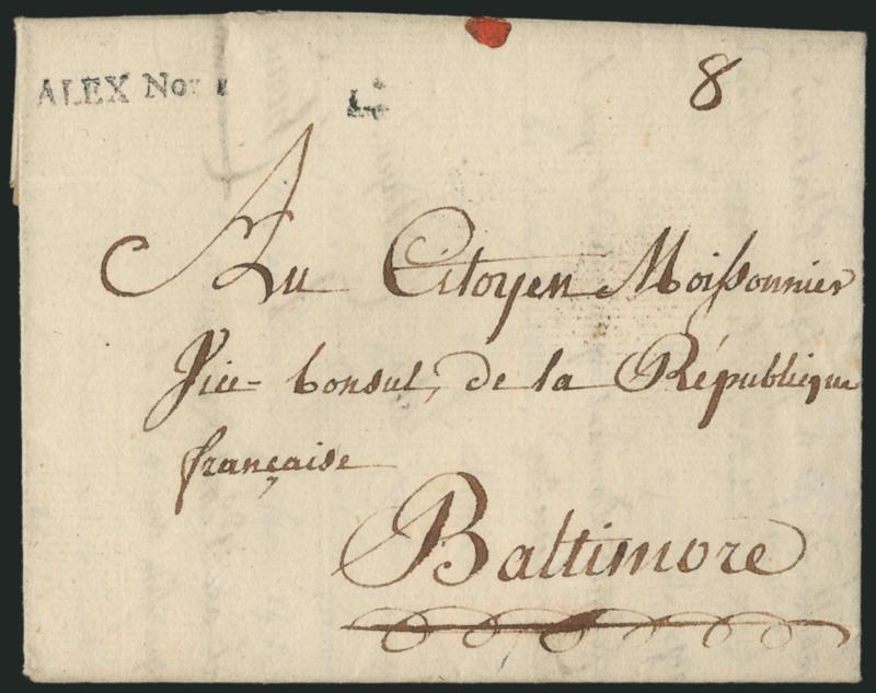 datestamp with ms. "8" rate on 1793 folded letter to the French Consul at Baltimore Md., Very Fine strike of this marking (Image)Search for comparables at SiegelAuctions.com |