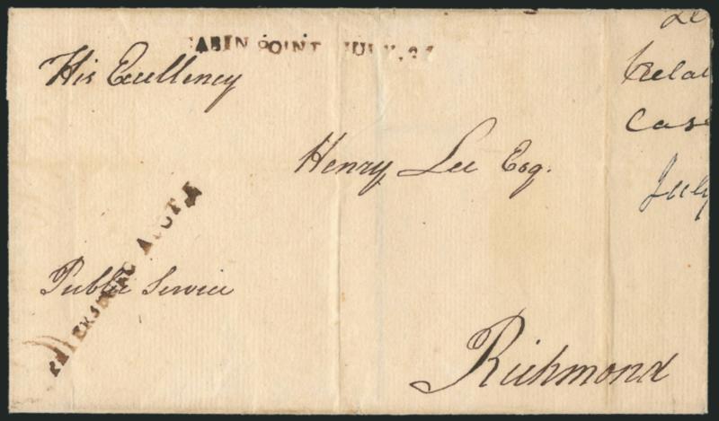 Henry Lee in Richmond Va. while Lee was governor, no postage rates, receipt docketing on flaps, slight wear along folds, Very Fine (Image)Search for comparables at SiegelAuctions.com |