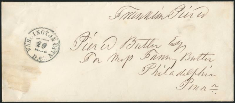 3441 c Franklin Pierce.> Free frank <<Franklin Pierce>> <as President> on legal-size cover addressed in his hand to Pierce Butler <<For Miss Fanny Butler>> in Philadelphia, Washington City D.C. Oct. 29, 1856 circular