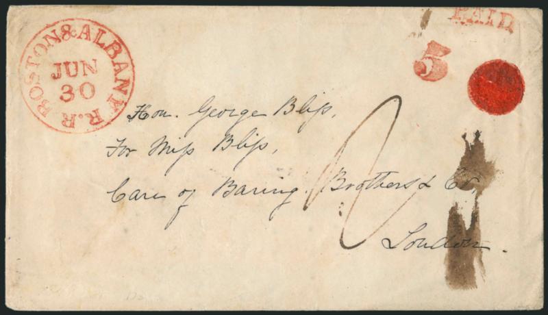 a few letters of <half-dime coin> tBoston & Albany R.R. Jun. 30. Route agent's red circular datestamp, matching "Paid" and "5" handstamps on cover to London, England, receiving backstamp (Jul. 14, 1847), ms. due, red wax seal at upper right shows a few letters of half-dime coin that was affixed to pay postage, ink smear at right, Very Fine, a most unusual railroad cover (Image)
