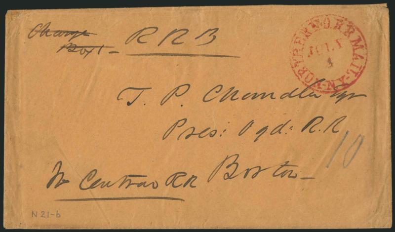 (Railroad Business), slight wrinkles aNorthern O. R.R. Mail N.Y. July 4. Mostly clear strike of red route agent's circular datestamp on brown cover to the president of the Ogdensburgh R.R. in Boston, charge box notation crossed out and marked "RRB" (Railroad Business), slight wrinkles and wear, Very Fine, a rare marking, ex Hicks (Image)