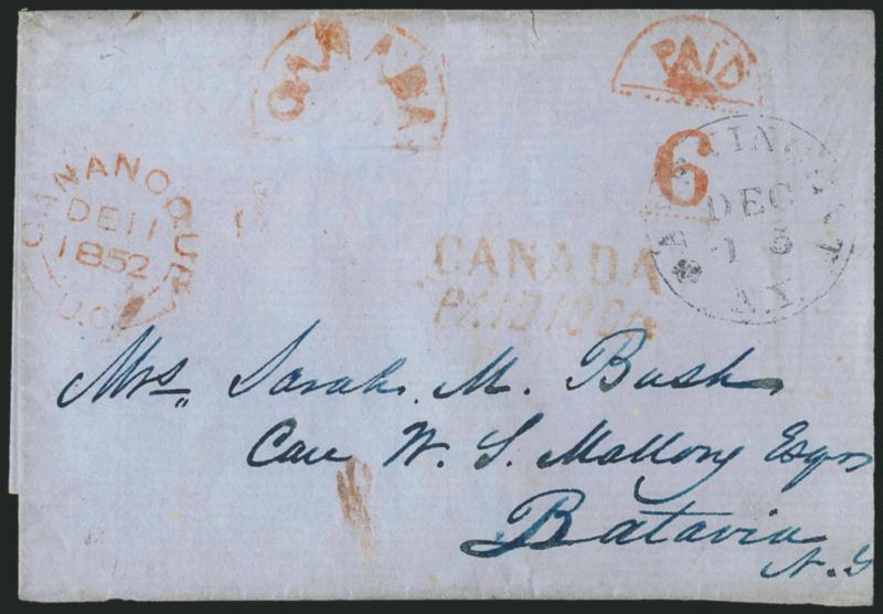 flaps missing), red ^CANADAPAID 10"CANADA" in Semi-Circle. Red handstamp withy matching "Paid" in semi-circle (same style) "6" rate handstamp and "Gananoque U.C. DE 11 1852" circular datestamp on mostly complete folded cover to Batavia N.Y. (two flaps missing), red "CANADA/PAID 10 Cts." two-line handstamp, "Cape Vincent N.Y. Dec. 15" exchange office datestamp, accompanied by an Apr. 1855 folded letter to Bridgewater Mass. with same red "Paid" in semi-circle and "6" handstamps, black Gananoque circular datestamp, black "Canada" in framed arc, Prescott backstamp, red Ogdensburgh N.Y. exchange office datestamp, Very Fine pair, the two show that Gananoque applied the very unusual and rare "Canada" semi-circle marking in 1852, the standard "Canada" arc was applied at Prescott in 1855 (Image)