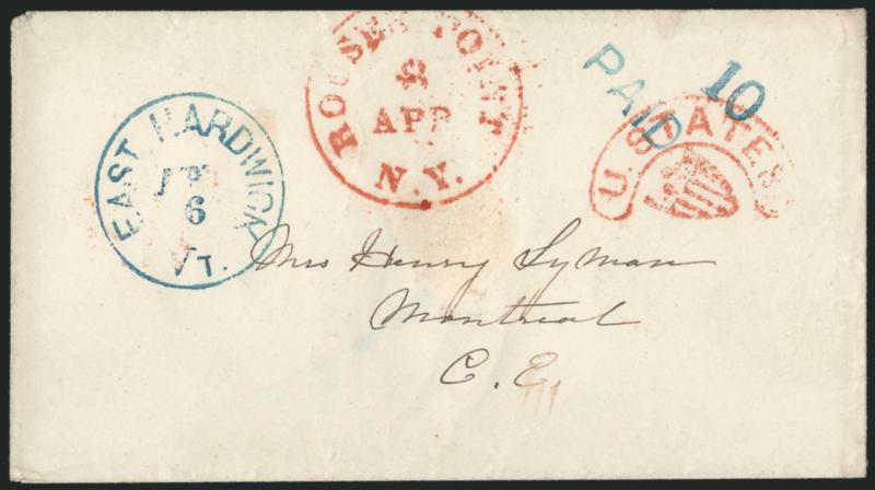 handstamps applied at origin o"U.STATES" Shield Handstamp (Rouses Point N.Y.). Clear strike of red handstamp with matching "Rouses Point N.Y. 8 Apr." circular datestamp, blue "East Harmony Vt. Apr. 6" circular datestamp and matching "Paid" and "10" handstamps applied at origin on small cover to Montreal, Canada, receiving backstamp, small piece out of flap, Very Fine, colorful and scarce (Image)