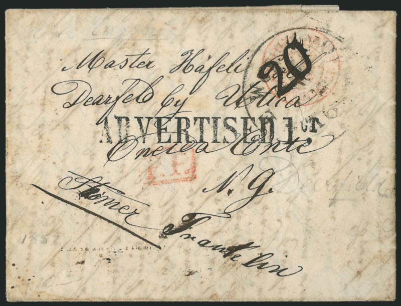 transit and matching P.P boxed handstADVERTISED 1 CT. (Utica N.Y.) Bold strike of straightline handstamp applied at Utica N.Y. on 1852 folded letter from Lurfal, Germany to "Dearfield by Utica", ms. Steamer Franklin" endorsement, red French transit and matching "P.P" boxed handstamp, New York circular datestamp with "10" re-rated "20" in manuscript, Very Fine, "Advertised" straightline markings are rare on transatlantic mail (Image)