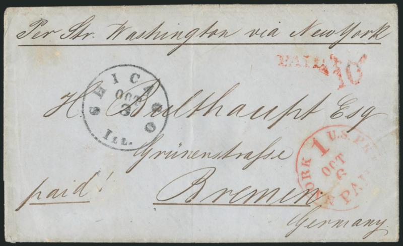 Washington via New York,>> accompaniedN. York U.S. Pkt. 1 Paid Oct. 6. Scarce 1c credit datestamp, "Chicago Ill. Oct. 3" circular datestamp, red "Paid" and "10" handstamps on blue 1856 folded letter to Bremen, Germany, sender's routing "Per Str. Washington via New York", accompanied by another cover to Wurttemburg with red "N. York U.S. Pkt. 8 Paid Nov. 3" 8c credit datestamp and blue Bremen Franco transit, Very Fine pair, both U.S. Packet markings are very scarce (Image)