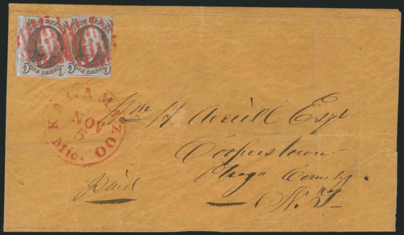 Accompanied by note from Calvet M. Hahn who notes that if this is indeed an 1849 usage then this would be the earliest reported use of the Boston Carrier stamp. His note also states that the color of the 5c stamp would point to an 1850 usage as he believes this comes from the third printing, which did not reach Boston until June 20, 1849.