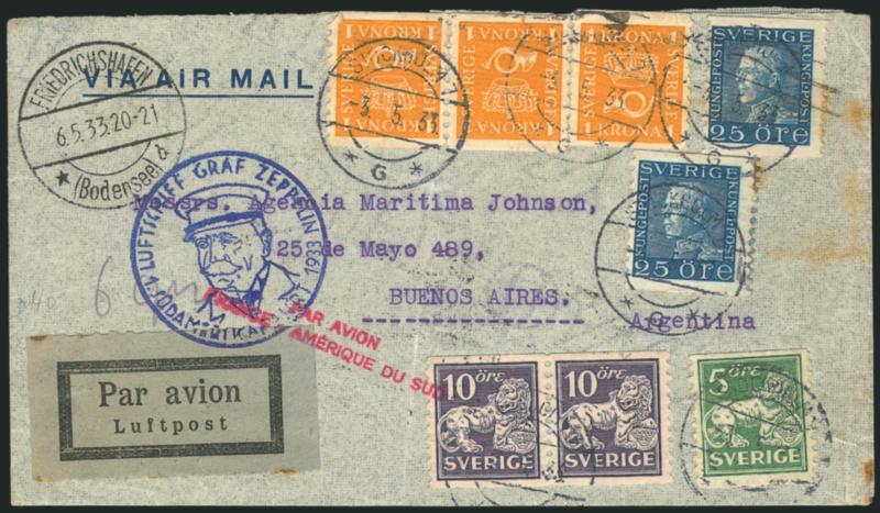 destinations incl. Chicago, Pernambuco and RioSweden Zeppelin Flight Covers. Two covers and a card for the October 14-November 2, 1933 Century of Progress Flight (Sieger 238E), two registered, all with both red Zeppelin cachets as customarily seen, destinations incl. Chicago, Pernambuco and Rio De Janeiro, variety of frankings, Fine-Very Fine, scarce (Image) E. 500-750