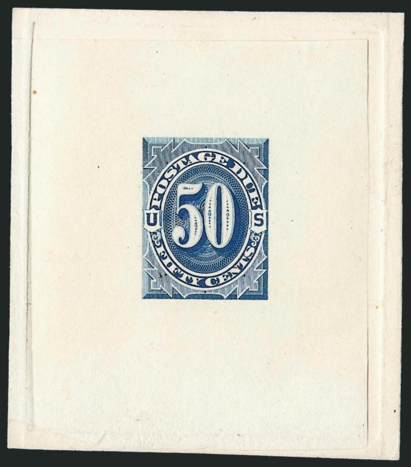 brown but is actually much darker, 2c cou1c-50c 1879 Postage Due, Large Die Trial Color Proofs in Either Sepia or Light Brown (J2TC1-J3TC1, J5TC5-J7TC1). On die sunk cards, 54 x 63mm and larger, 2c and 3c with die imprints at top, 3c is the "light brown" but is actually much darker, 2c couple trivial toning specks, otherwise Very Fine-Extremely Fine, 1c and 5c are not listed in either the light brown or sepia colors (Image)