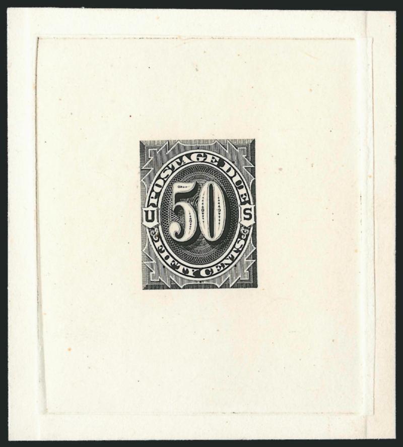 Fine-Extremely Fine1c-50c 1879 Postage Due, Large Die Trial Color Proofs in Black (J1TC1-J2TC1, J4TC1-J7TC1). Complete less 3c, on die sunk cards, 1c-5c 57 x 66mm, 10c-50c 59 x 68mm, 1c-5c with die numbers at top, Very Fine-Extremely Fine (Image)
