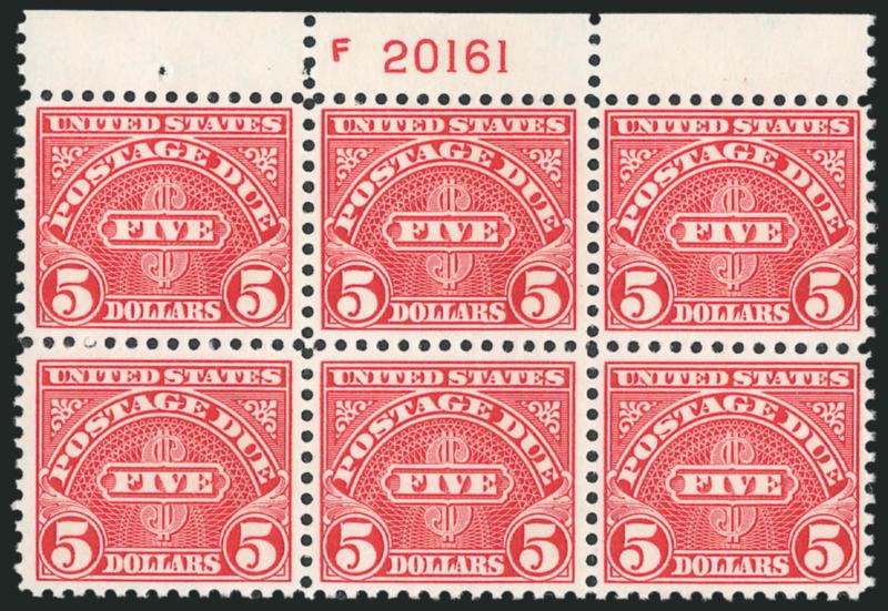 5405 nhbl 50c Carmine Rose, Postage Due (J67).> Mint N.H. bottom imprint, star and plate no, block of six, brilliant color and crisp impression, choice centering, fresh and Extremely Fine, a beautiful plate block, with