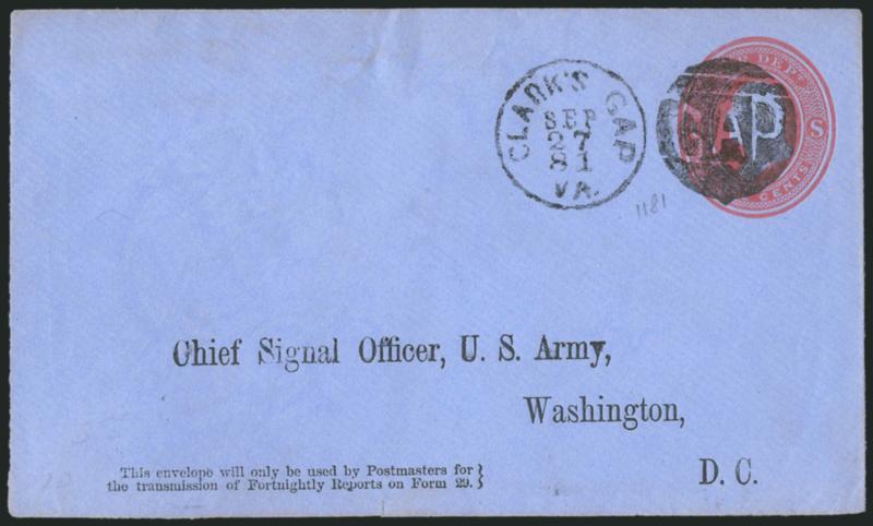 5582 c War Department Postal Stationery. More than 150 entires and a handful of cut squares, two 3c entires from Headquarters of William Tecumseh Sherman, one addressed by Sherman to his wife and another addressed by his wife to his son, bulk of the collection consists of a vast range of Signal Officer usages, incl. one each from Canada and Belgium bearing stamps from those countries, territorial usages with a 15c Dark Red on White (UO27), Nos. UO51 and UO55 with A.P.S. certificates as earliest documented uses, railroad postmarks, postmaster and county postmarks, transition to penalty envelopes, late uses, etc., overall condition Fine-Very Fine, with much useful material