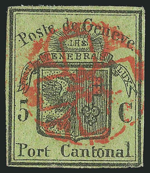 5636   GENEVA, 1847, 5c Black on Yellow Green, Large Eagle (2L3).> Pos. 94, margins all around, neat red rosette cancel, Very Fine, with 2001 Rellstab certificateGENEVA, 1847, 5c Black on Yellow Green, Large Eagle (2L3). Pos. 94, margins all around, neat red rosette cancel, Very Fine, with 2001 Rellstab certificate (Image)