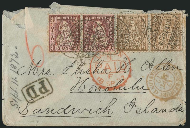 stamps also tied by red London transit, FrSWITZERLAND, 1872, 5c Dark Brown, 50c Violet (43, 59). Horizontal pair of each, tied by "Lausanne 16.IX.72" circular datestamps on Allen correspondence tissue cover to Honolulu, Sandwich Islands (Hawaii), stamps also tied by red London transit, French transits, red crayon "6" credit, some cover flaws, still Very Fine and rare usage from Switzerland to Hawaii (Image)